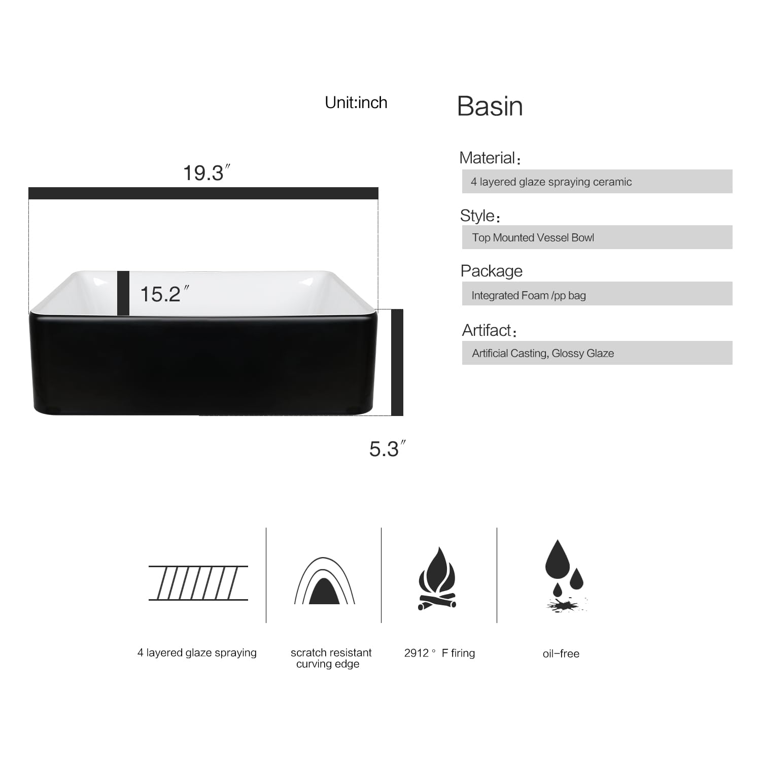 • - Cabinet: 19"x 24"x 31.5"(D×W× H); Sink dimension: 19.3"L x 15.2"W x 5.3"H; Bowl thickness: 0.6";