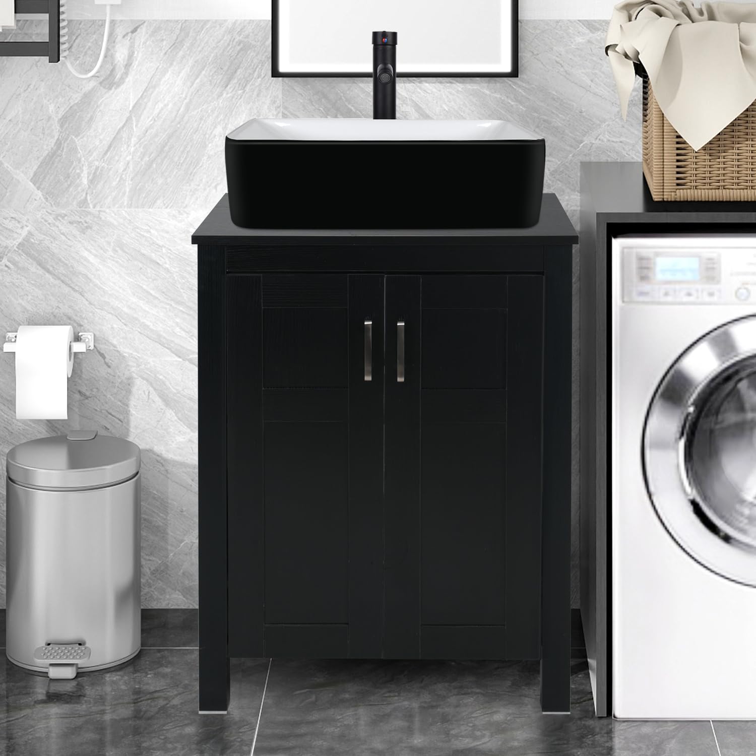 Puluomis 24-Inch Traditional Bathroom Vanity with Square Black and White Ceramic Porcelain Sink Top, Wood Single Vessel Sink Bowl with Faucet Set