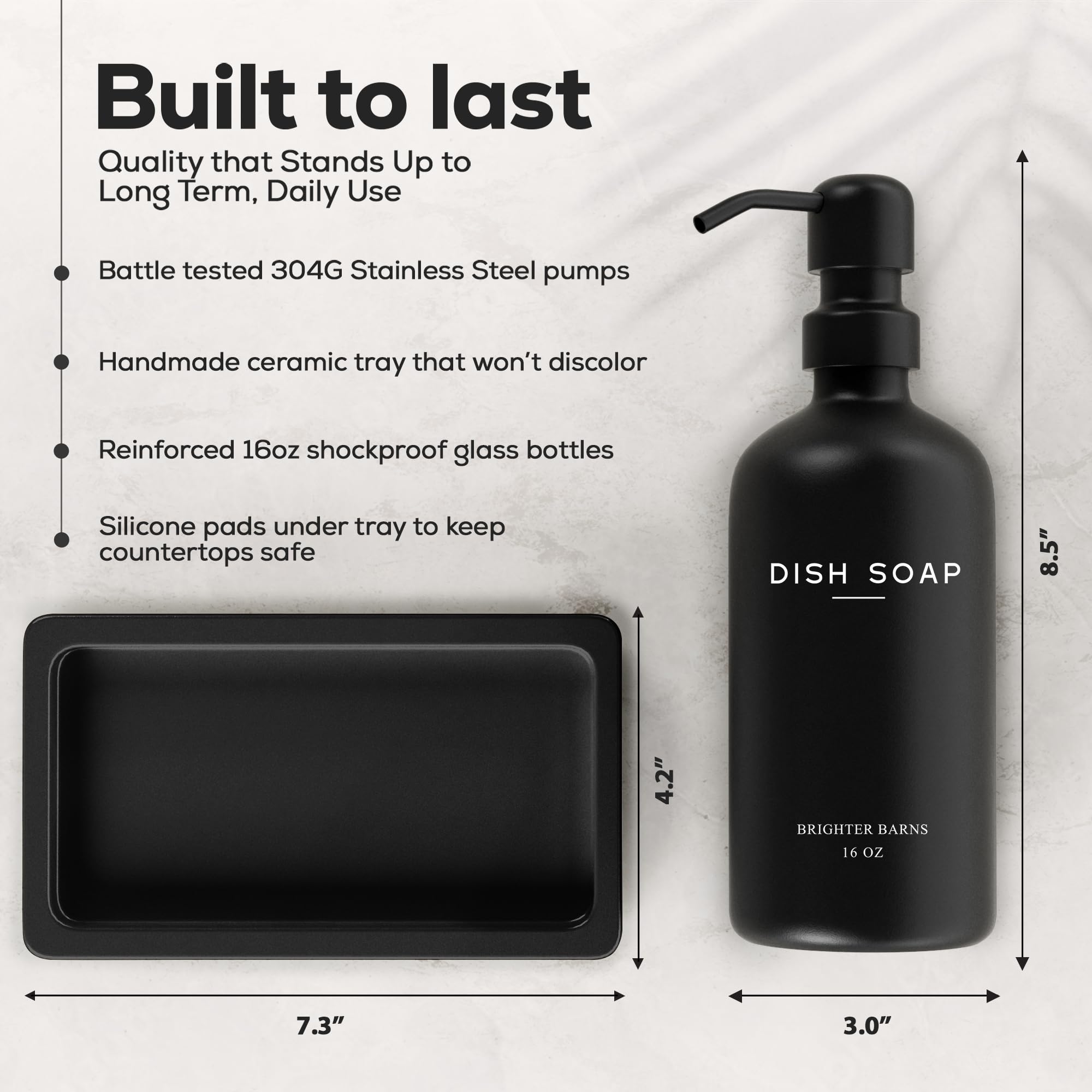 - AMERICAN DESIGN, UNCOMPROMISING QUALITY - Crafted with meticulous attention to detail, our black glass soap dispenser with pump set features 2 robust 16oz glass bottles, corrosion-proof 304G stainless steel pumps, and a stain-resistant ceramic tray. All designed in the USA to provide unbeatable quality and enduring style that you can trust.