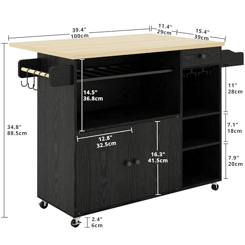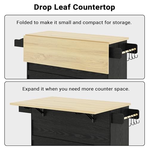 IRONCK Rolling Kitchen Island Cart with Drop-Leaf and Wine Rack, Microwave Rack Serving Cart on Wheels with Drawer & Shelves & Spice Rack & Cup Hanging, Black