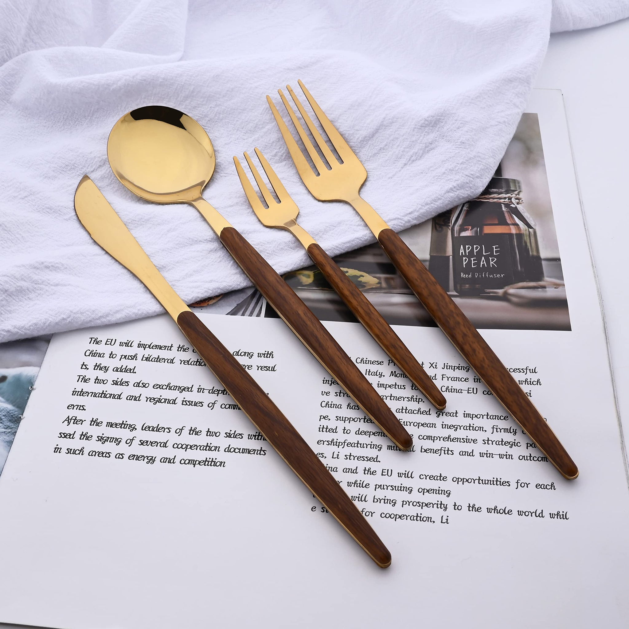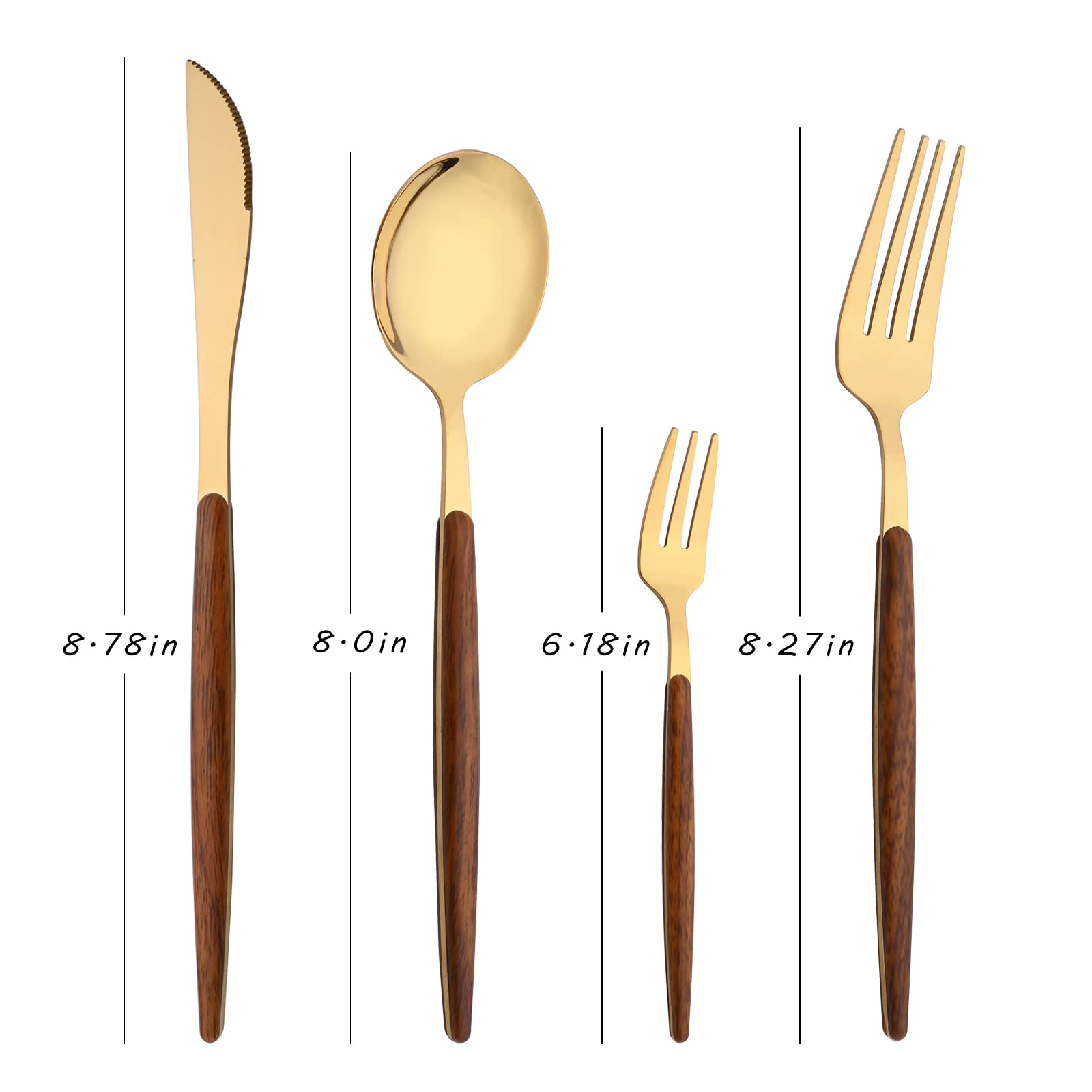 Details: This faux-wood handle stainless steel flatware set, clear texture. Elegant look will make good match your existing tableware. Ideal for home kitchen, restaurant, dinner, party, and everyday meals.