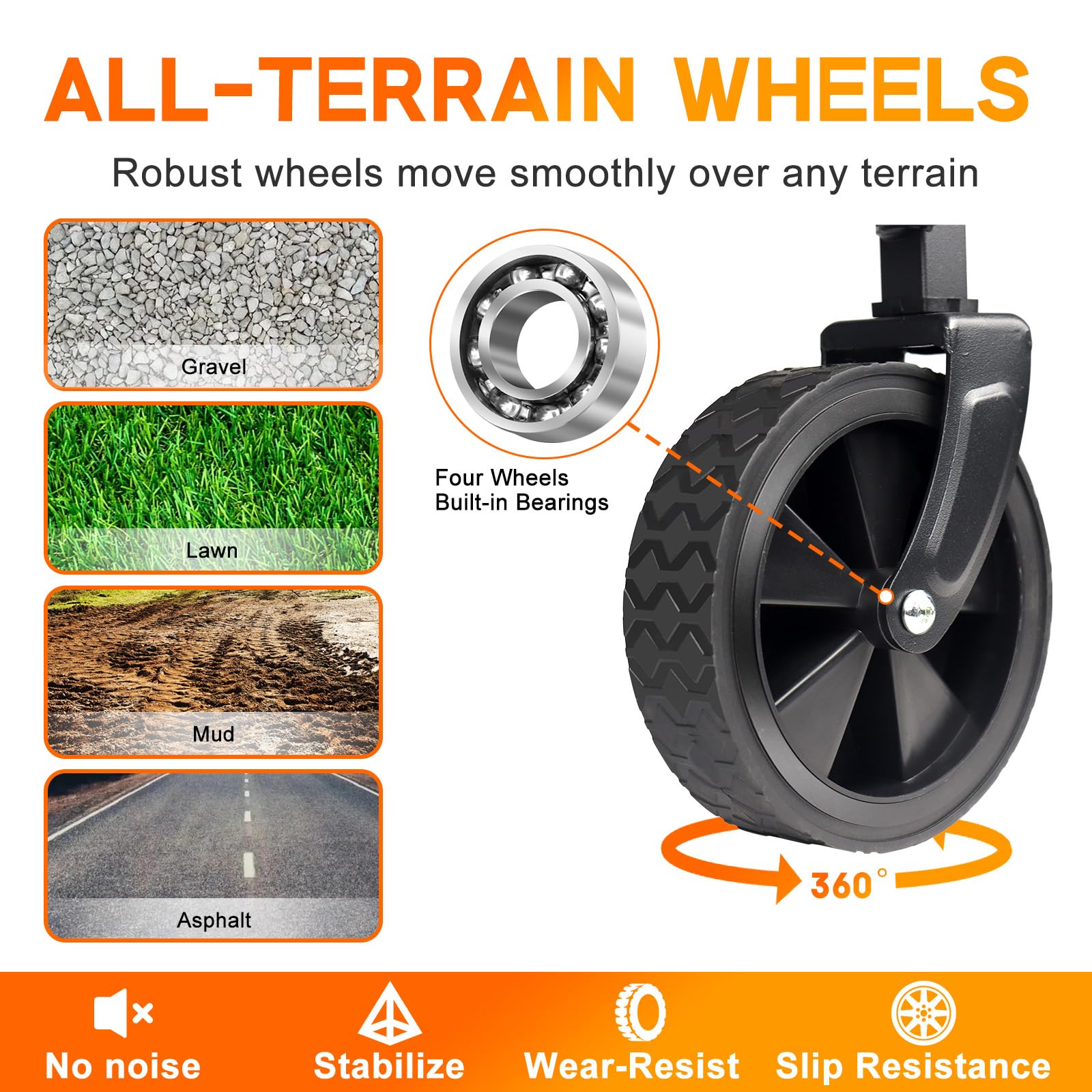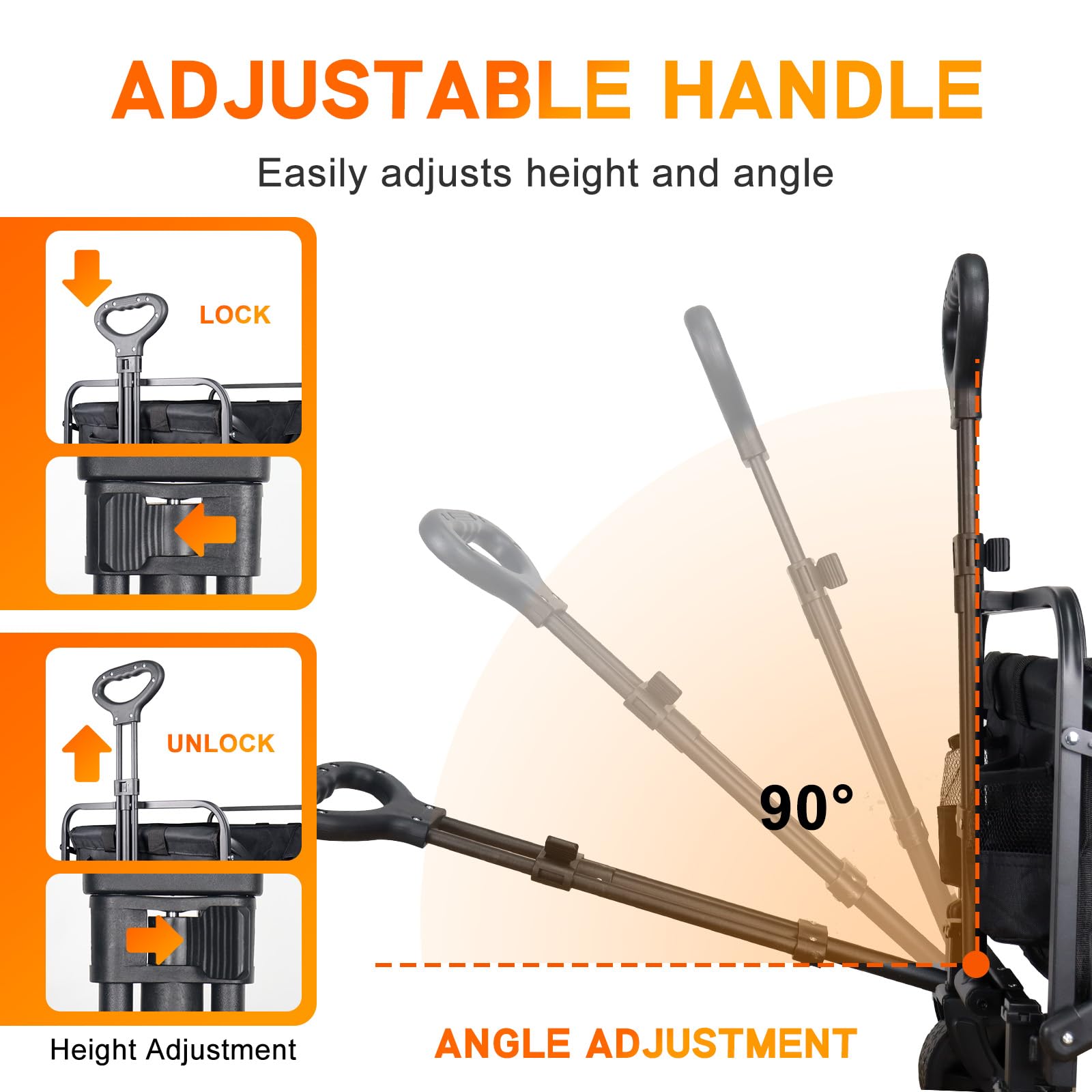 - Smooth Transport: With two 360° rotating front wheels and adjustable pull rods, you can effortlessly control the direction of the wagon, saving both time and labor. The handle length can be extended from 26" to 35.8" and 90° rotating.