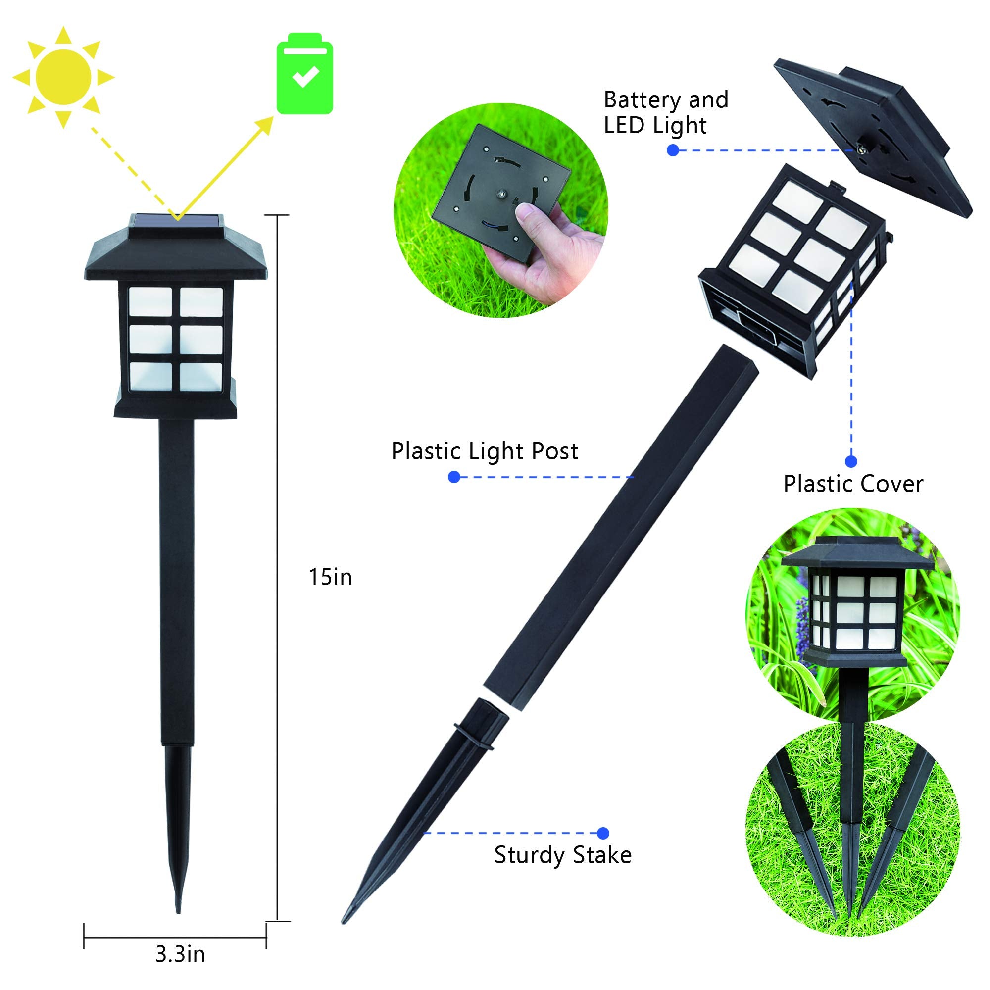 • 【PERFECT PERFORMANCE】Differentiates with other similar products, our solar yard lights are equipped with High-resistance ABS material,2V 30ma Solar panel and 1.2V/1PC 100mAh AAA Ni-MH rechargeable battery.Each Lights is safe and reliable with high-quality,long-endurance and stable work.