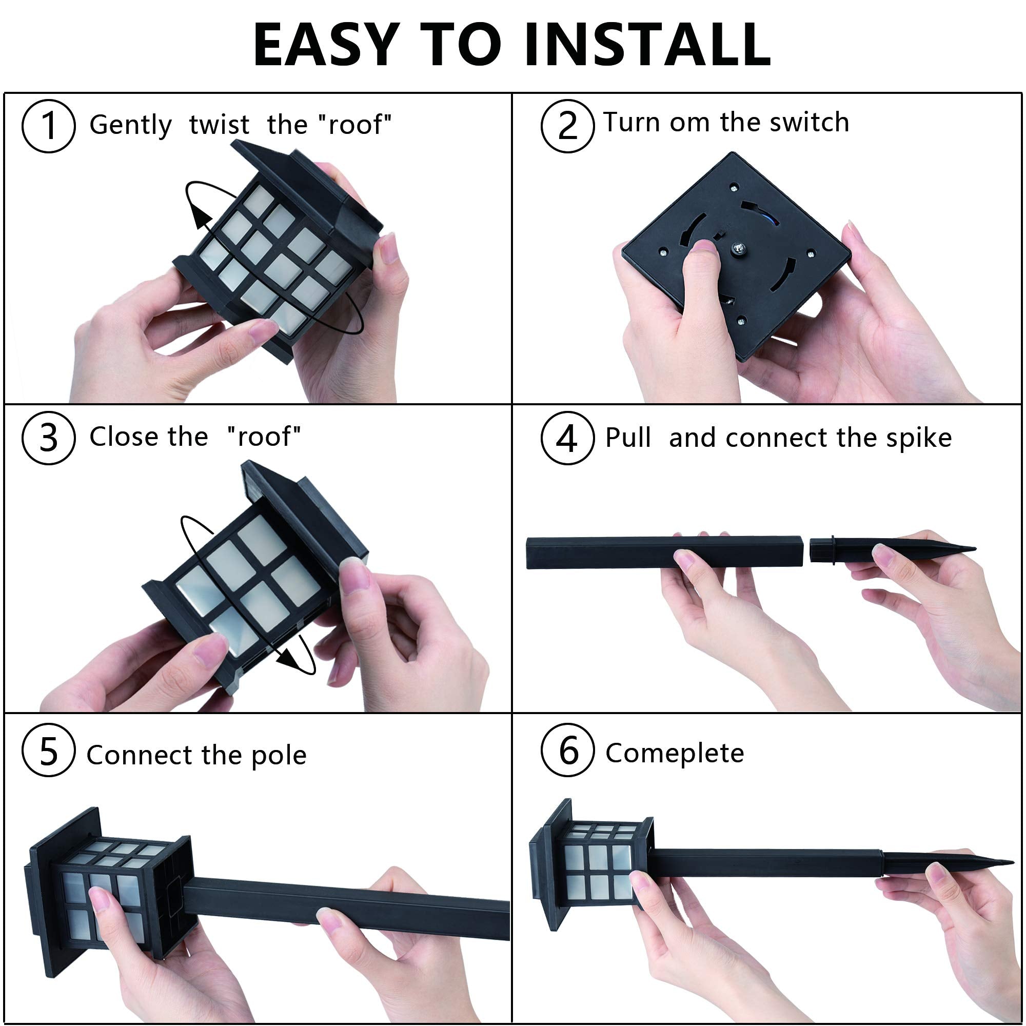 • 【EASY TO INSTALL】No additional tools, wiring, or power supply is needed. Installation steps is packed in the box.ONLY 3 MINUTES,the installation can be completed. The Solar garden lights turn on at nigh and turn off at dawn automatically.