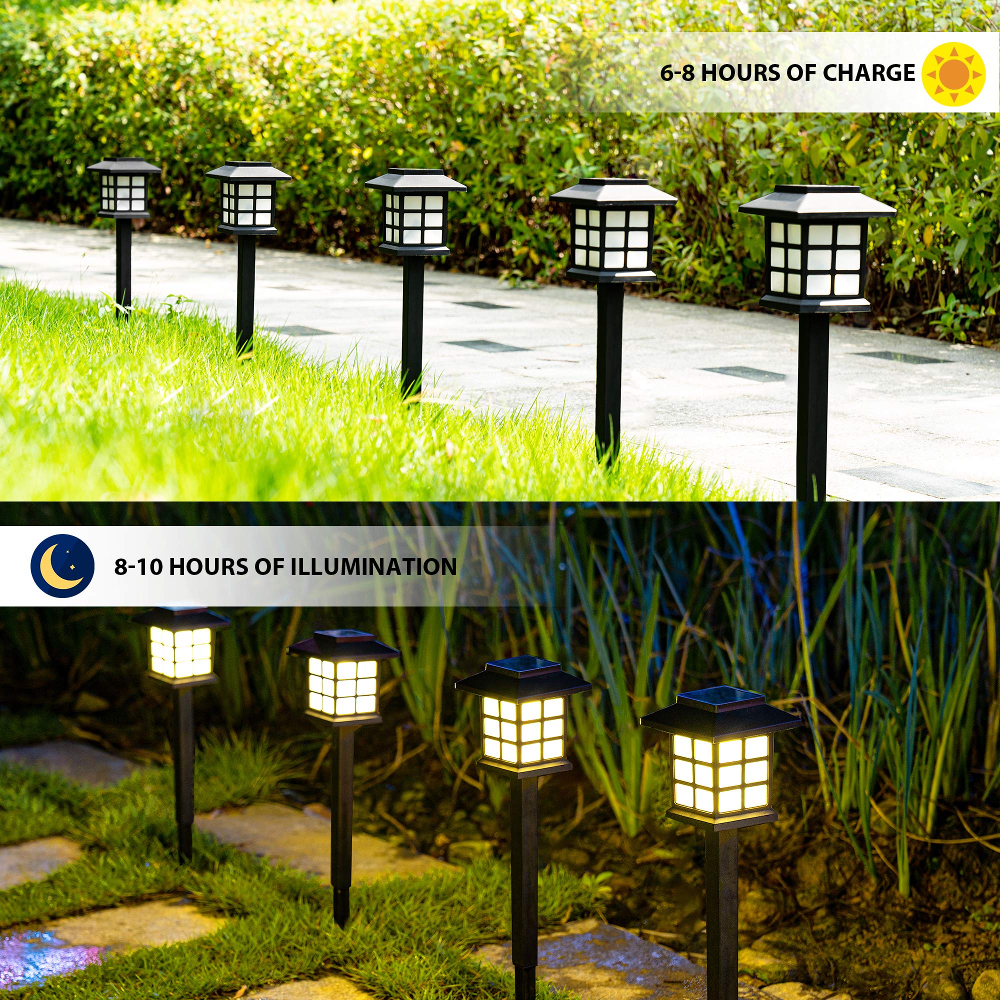 • 【SOLAR OUTDOOR LIGHTS】Gigalumi solar lights are powered by the sun.They automatically charge during the day, over a period of 6-8 hours. Then, they turn on automatically at night, providing at least 8H of lighting.A suitable choose for beautifying the garden or as a perfect gift for family and friends.