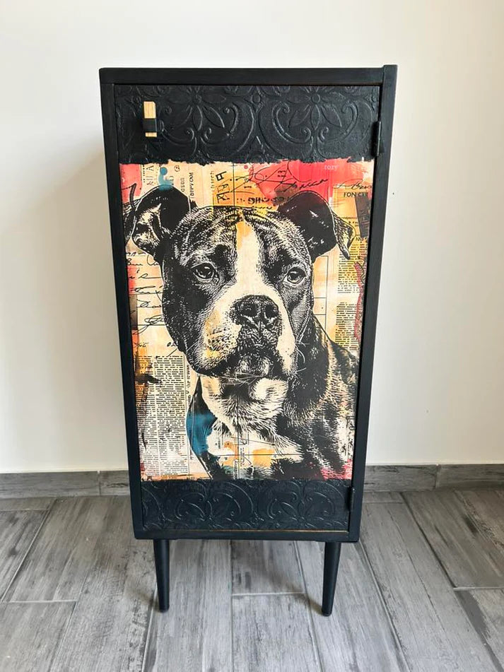 This design brings together the bold charm of layered newspaper textures, vibrant alcohol inks, stamps, block printing, and intricate ink sketches. It’s a love letter to mixed-media art and the expressive personalities of our canine companions.