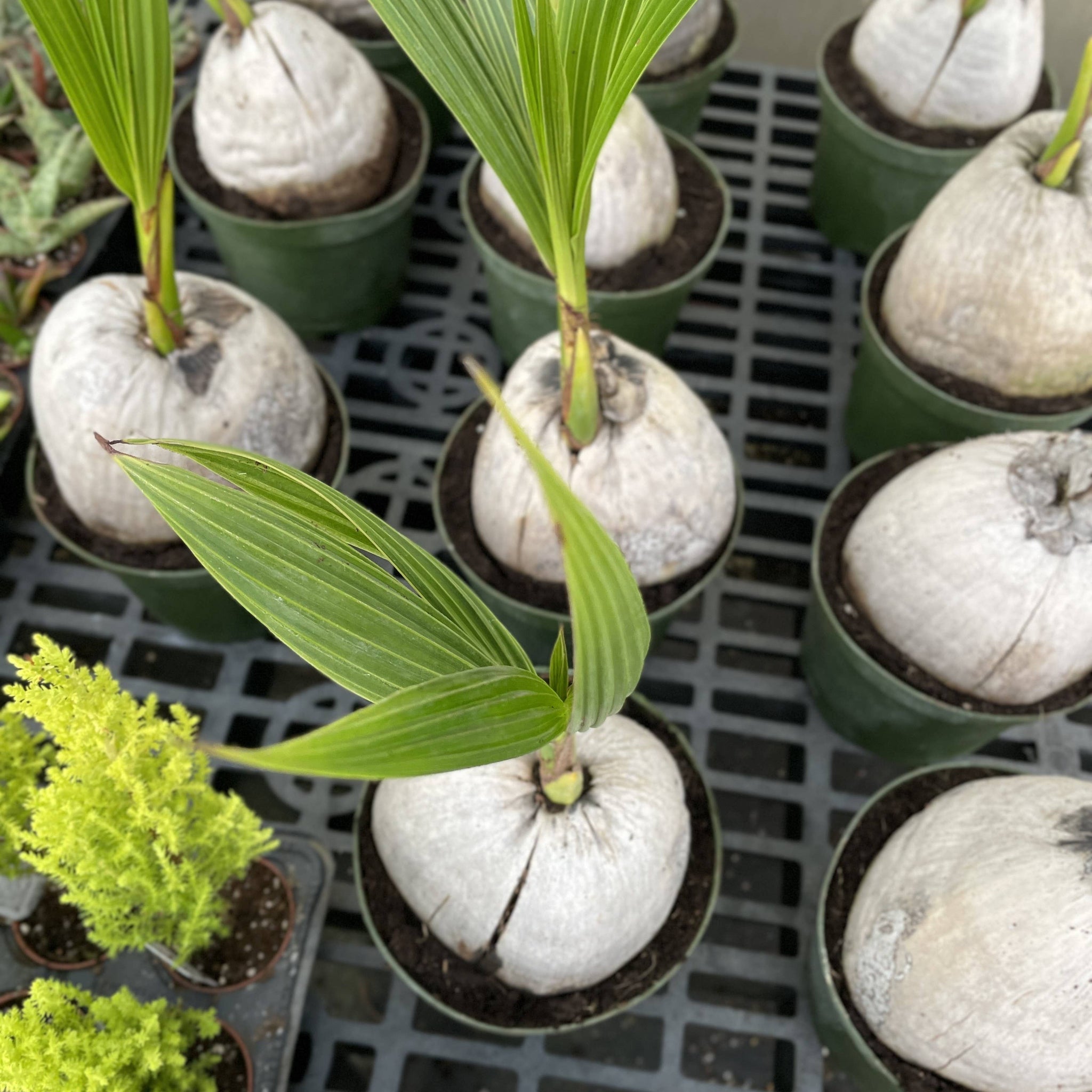 Botanical Name: Cocos nucifera. Thrives in indirect bright sunlight. This plant will arrive in a 6" diameter plastic growers pot with drainage holes. Pot color may vary. Height will range from 15-20" tall.
