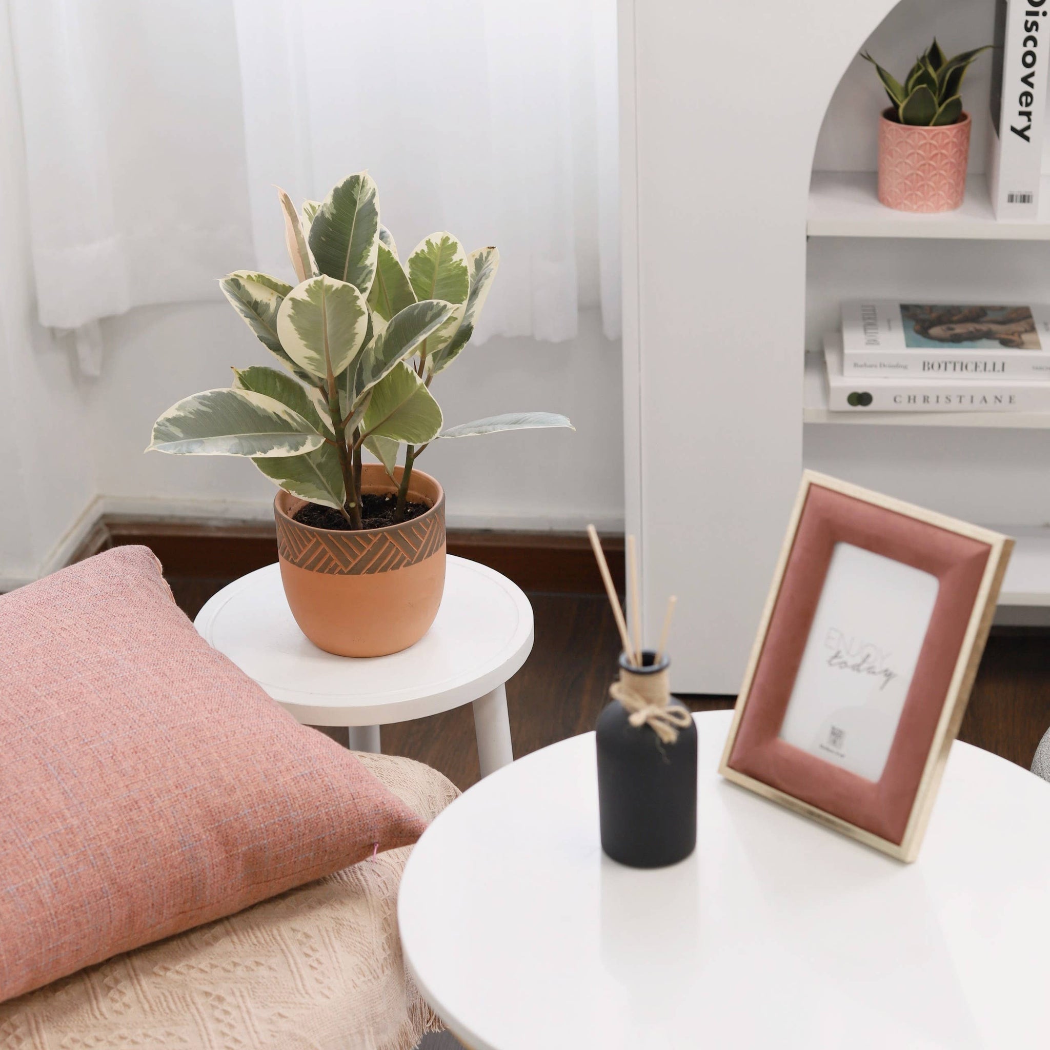Our beautiful rooted Ficus Elastica Ruby Pink is available in 4/6 inch size.