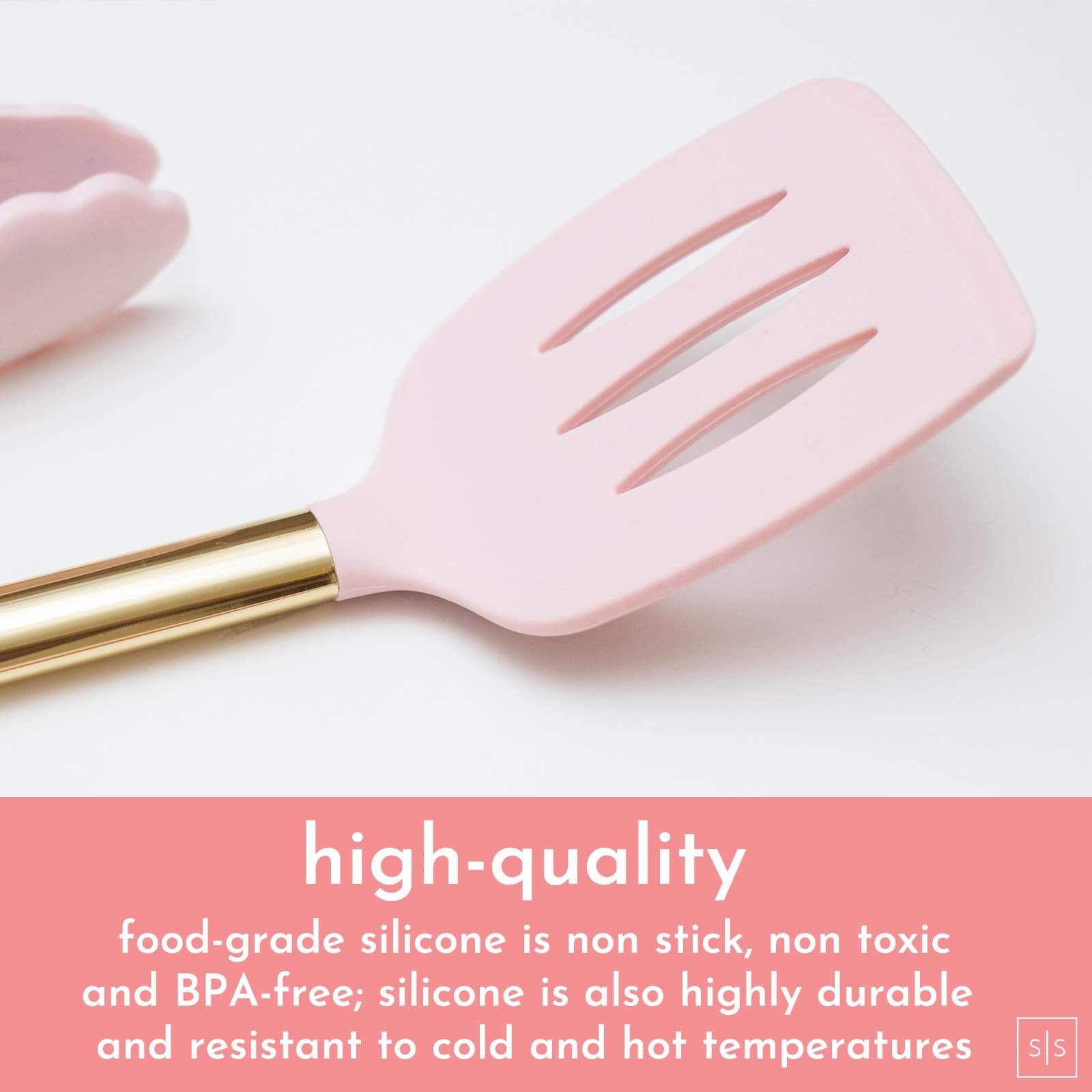 - ✔ PRETTY IN PINK 7 PIECE SILICONE COOKING UTENSIL SET WITH MATCHING GOLD UTENSIL HOLDER — complement pink kitchen decor or pink kitchen accessories with this luxurious, glimmering gold utensils set with pink silicone accents; complete set includes gold and pink spoon, gold and pink silicone turner, gold and pink spatula, pink and gold tongs with soft silicone tips, gold soup ladle, gold whisk, and matching gold kitchen utensil holder for effortless organization and display in your kitchen