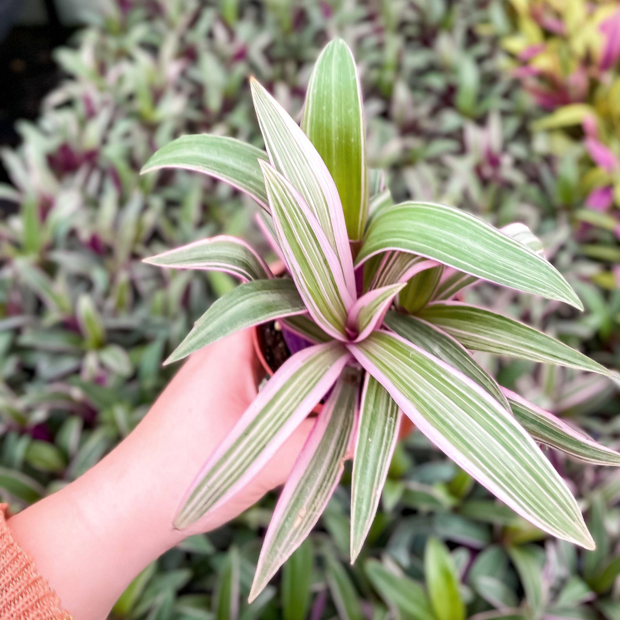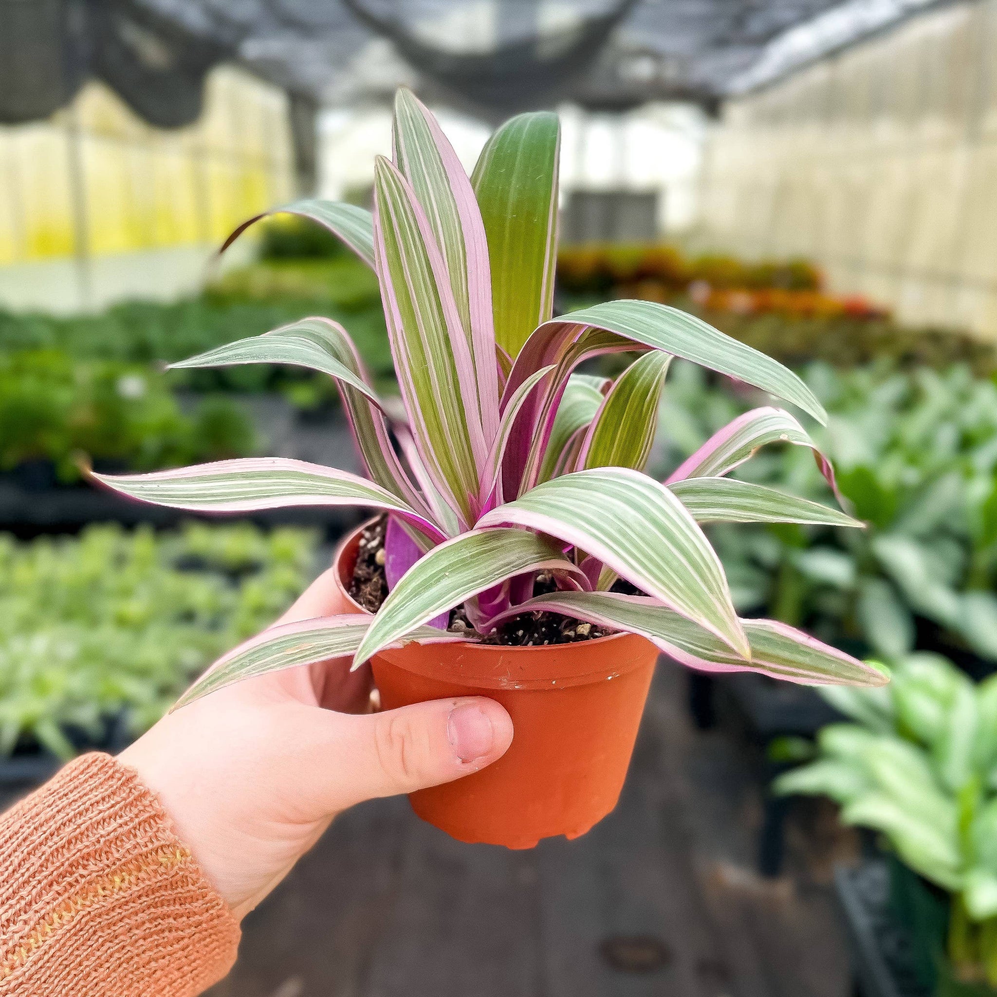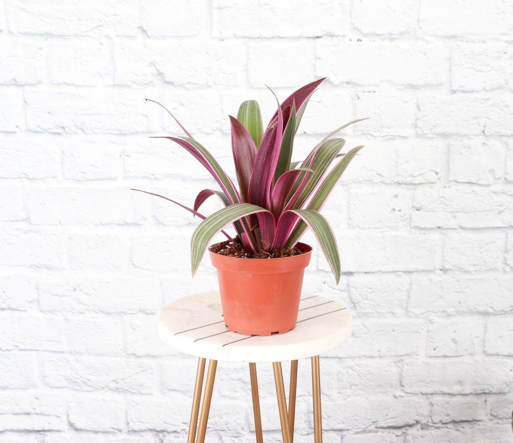 Botanical Name: Tradescantia spathacea. Thrives in medium to indirect bright sunlight. This plant will arrive in a 4" diameter plastic growers pot with drainage holes. Pot color may vary. Height will range from 5-8" tall. Decorative pots not included.